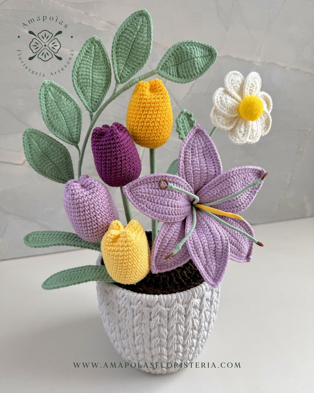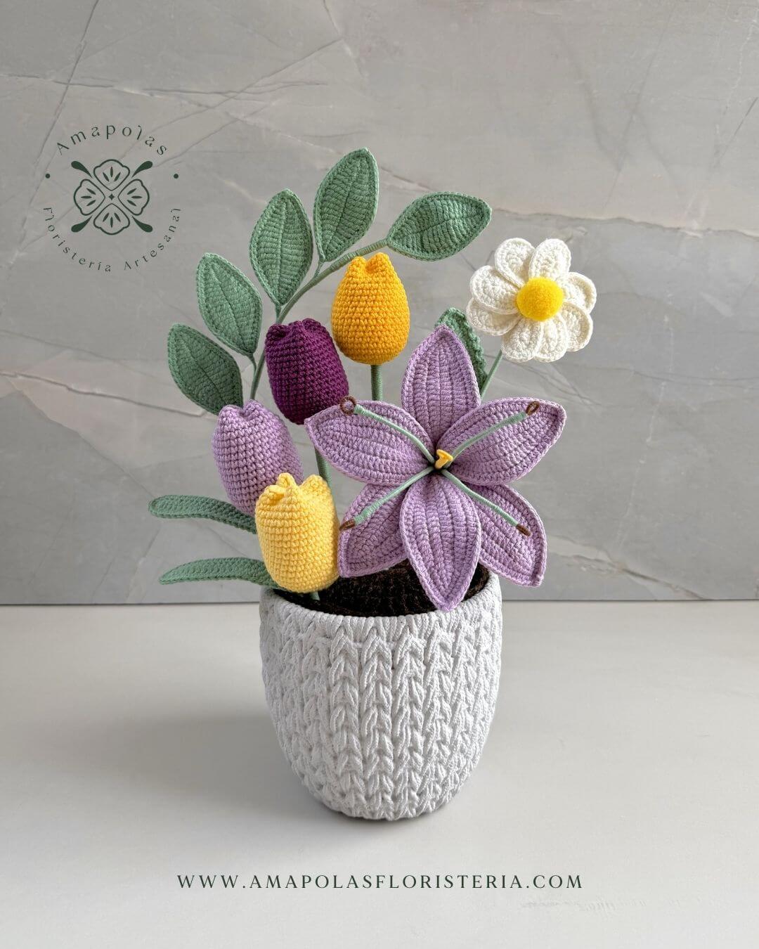 * 🌱Radiante lirio tejido pétalo a pétalo con 4 elegantes tulipanes clásicos y 1 hermosa margarita tejida pétalo a pétalo, todo armonizado con delicadeza.