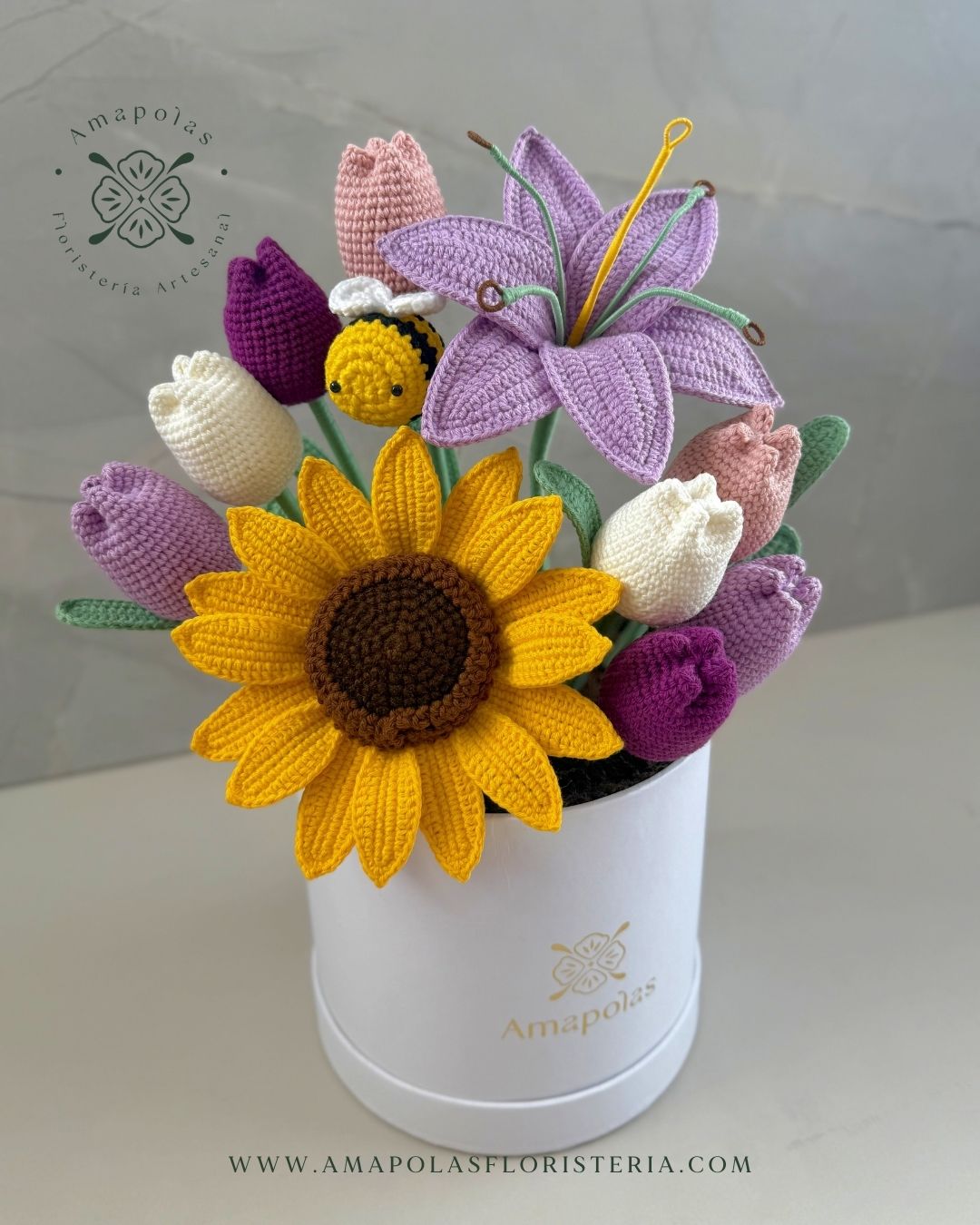 Caja de material plastificado con 1 radiante lirio, 1 hermoso girasol tejido pétalo a pétalo, 8 elegantes tulipanes y 1 adorable abejita. Presentado en nuestra exclusiva bolsa de regalo de la marca, pensada para sorprender.