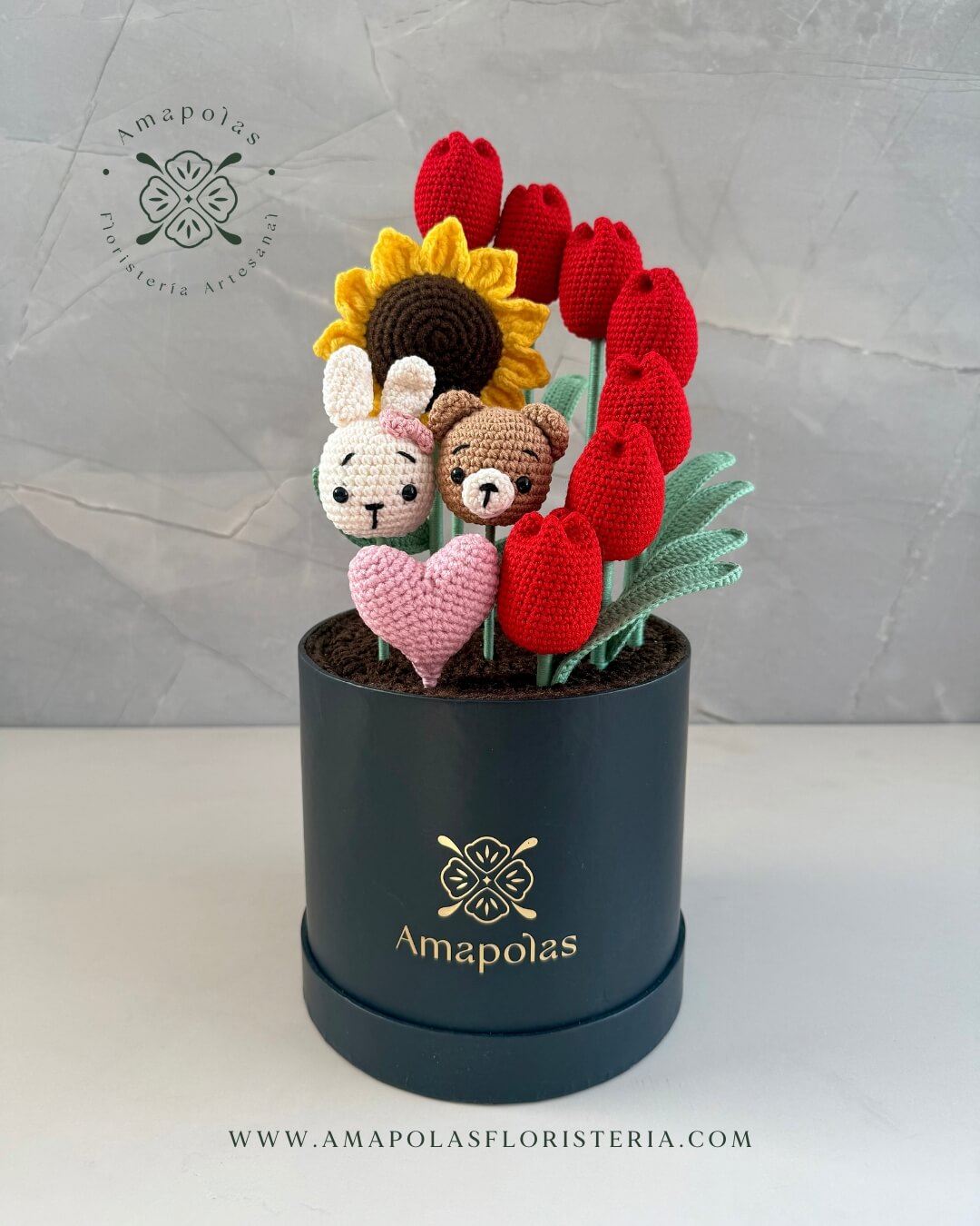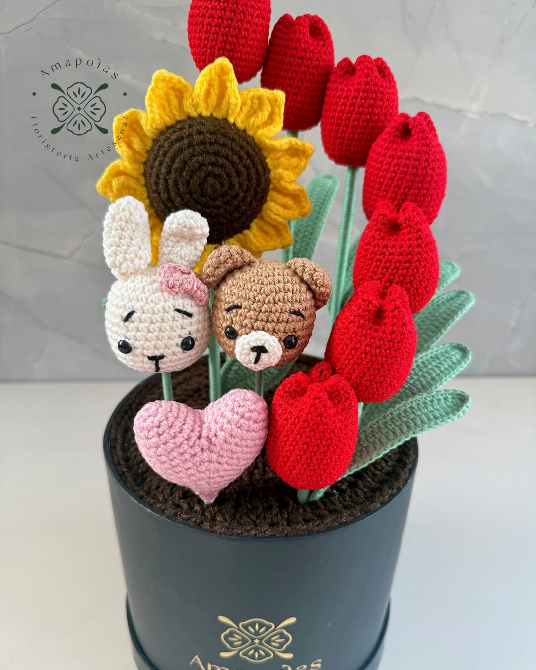 Caja de material plastificado con 7 elegantes tulipanes, 1 radiante girasol, 1 adorable osito y 1 tierna conejita con 1 corazón tejido del color de tu elección. Presentado en nuestra exclusiva bolsa de regalo de la marca, pensada para sorprender.