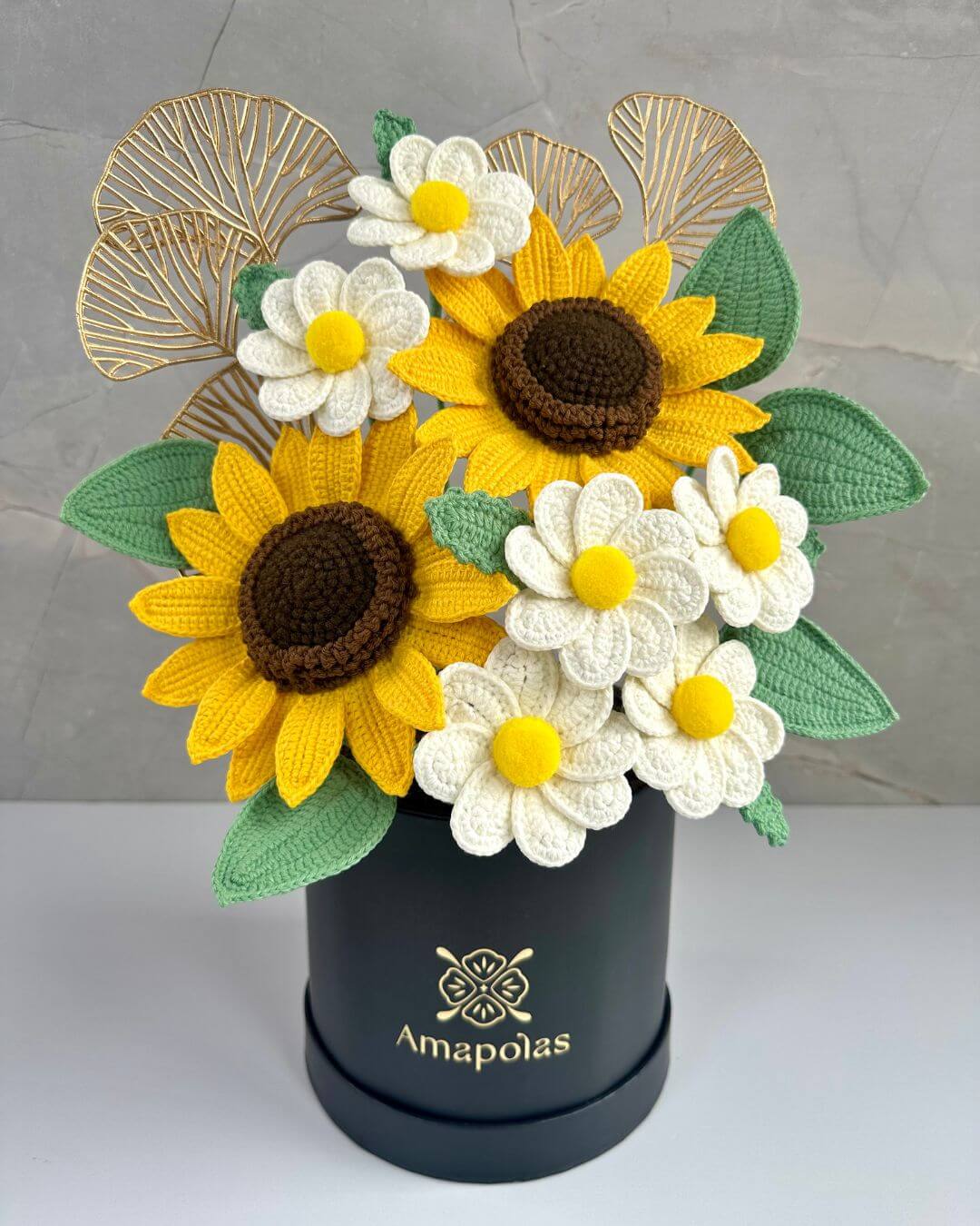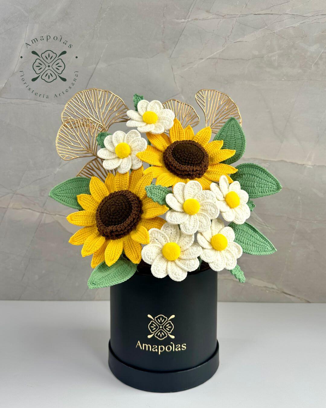 Caja de material plastificado con 2 radiantes girasoles tejidos pétalo a pétalo, 6 elegantes margaritas con follaje variado de color dorado. Presentado en nuestra exclusiva bolsa de regalo de la marca, pensada para sorprender.