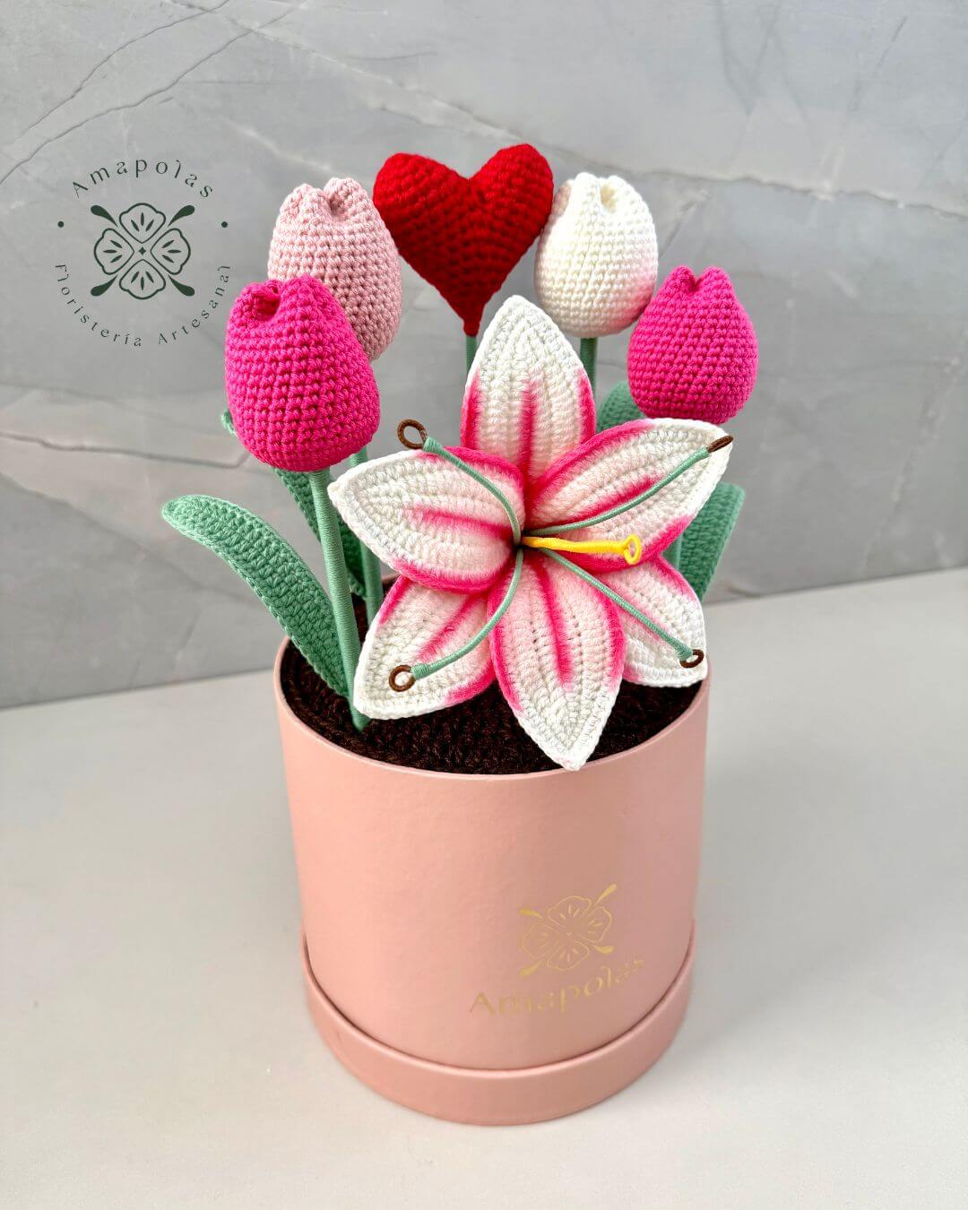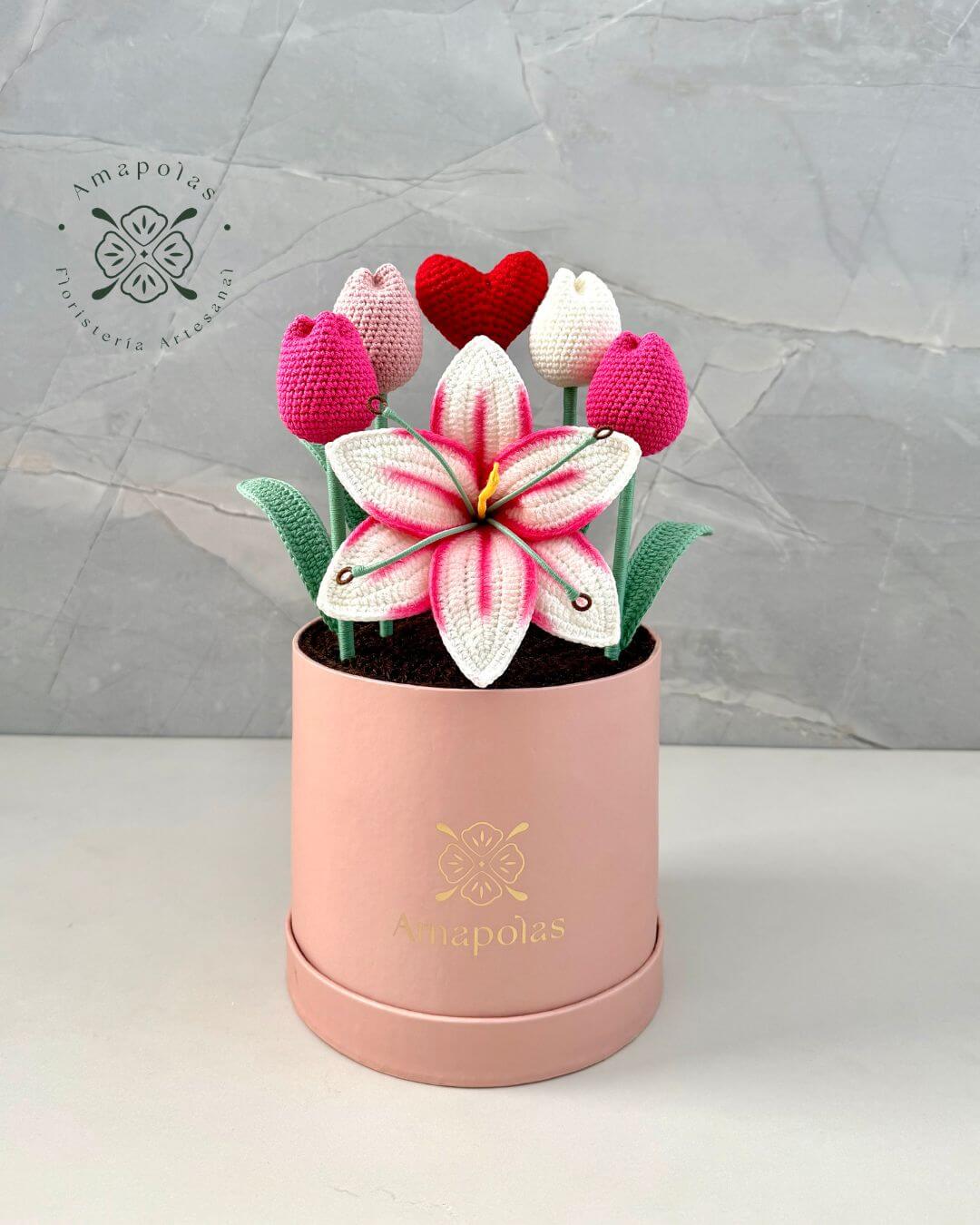 * 🌷Caja de material plastificado, con 4 elegantes tulipanes, un corazón tejido y un radiante lirio.