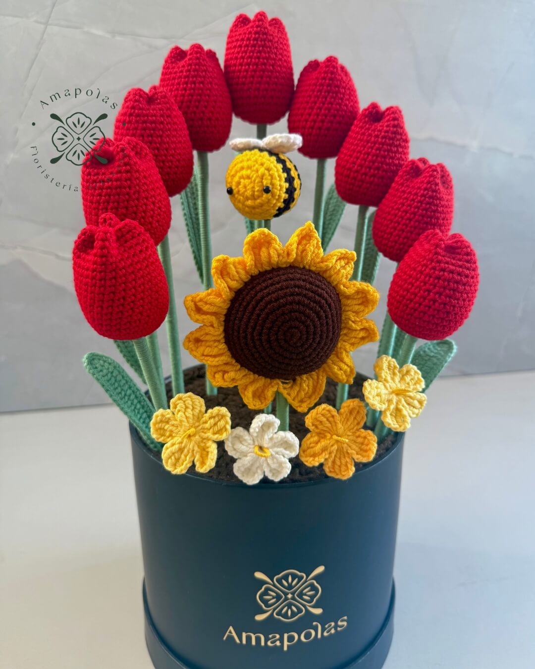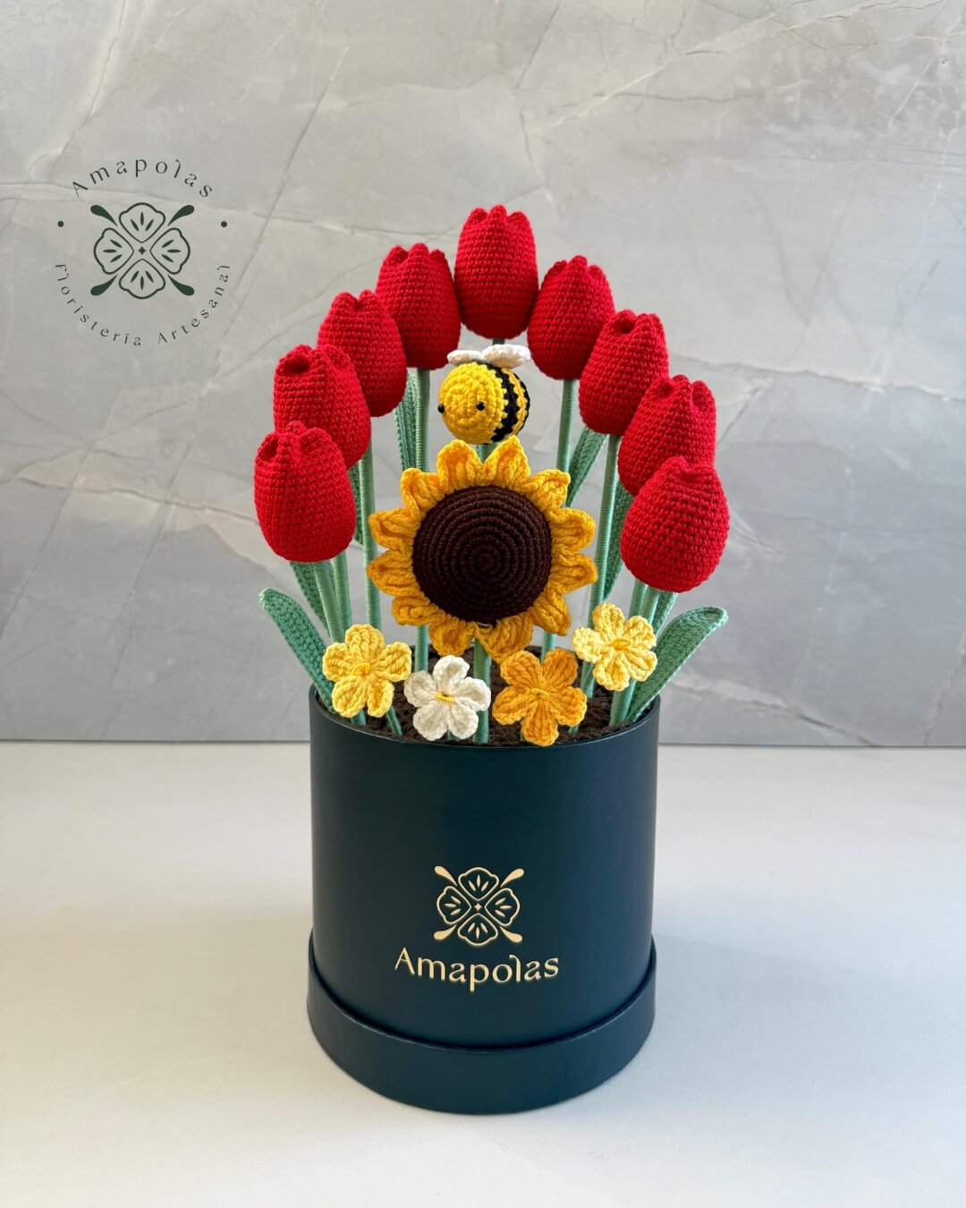 Caja de material plastificado con 7 elegantes tulipanes, 4 hermosas mini flores , 1 radiante girasol y 1 adorable abejita tejida aromatizado con suaves fragancias florales, para una experiencia sensorial única. Presentado en nuestra exclusiva bolsa de regalo de la marca, pensada para sorprender.