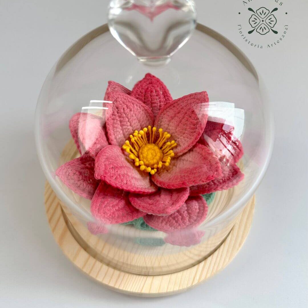 • 🪷Hermosa flor de loto tejida pétalo a pétalo en cúpula de vidrio con base de madera.