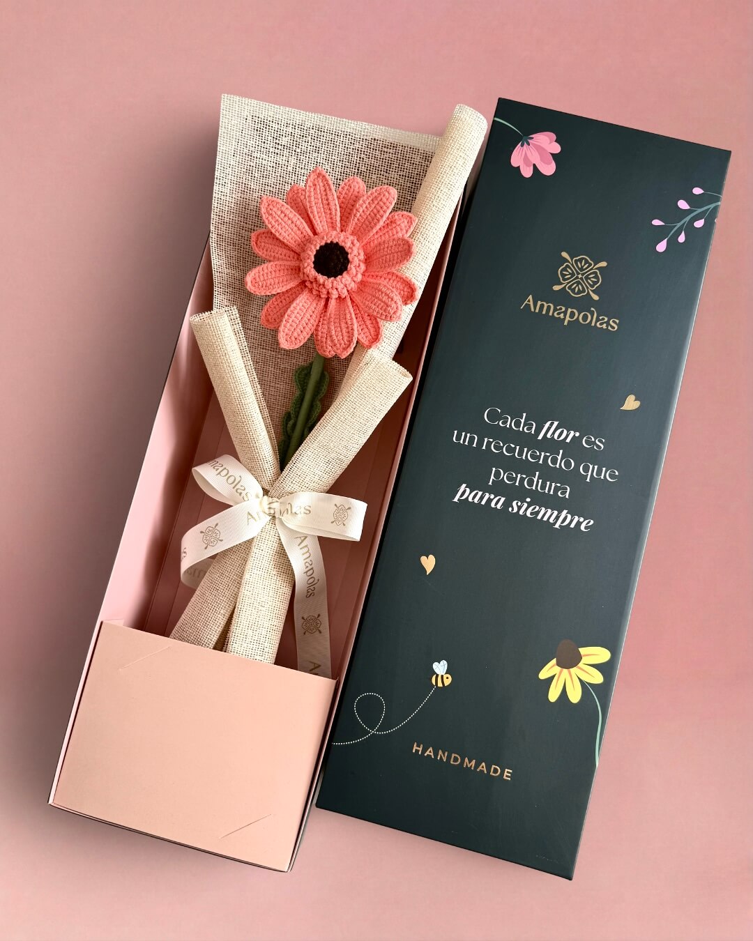 1 hermosa Gerbera tejida pétalo a pétalo en el color que tú elijas aromatizado con suaves fragancias florales, para una experiencia sensorial única. Presentado en nuestra exclusiva caja de la marca, pensada para sorprender.