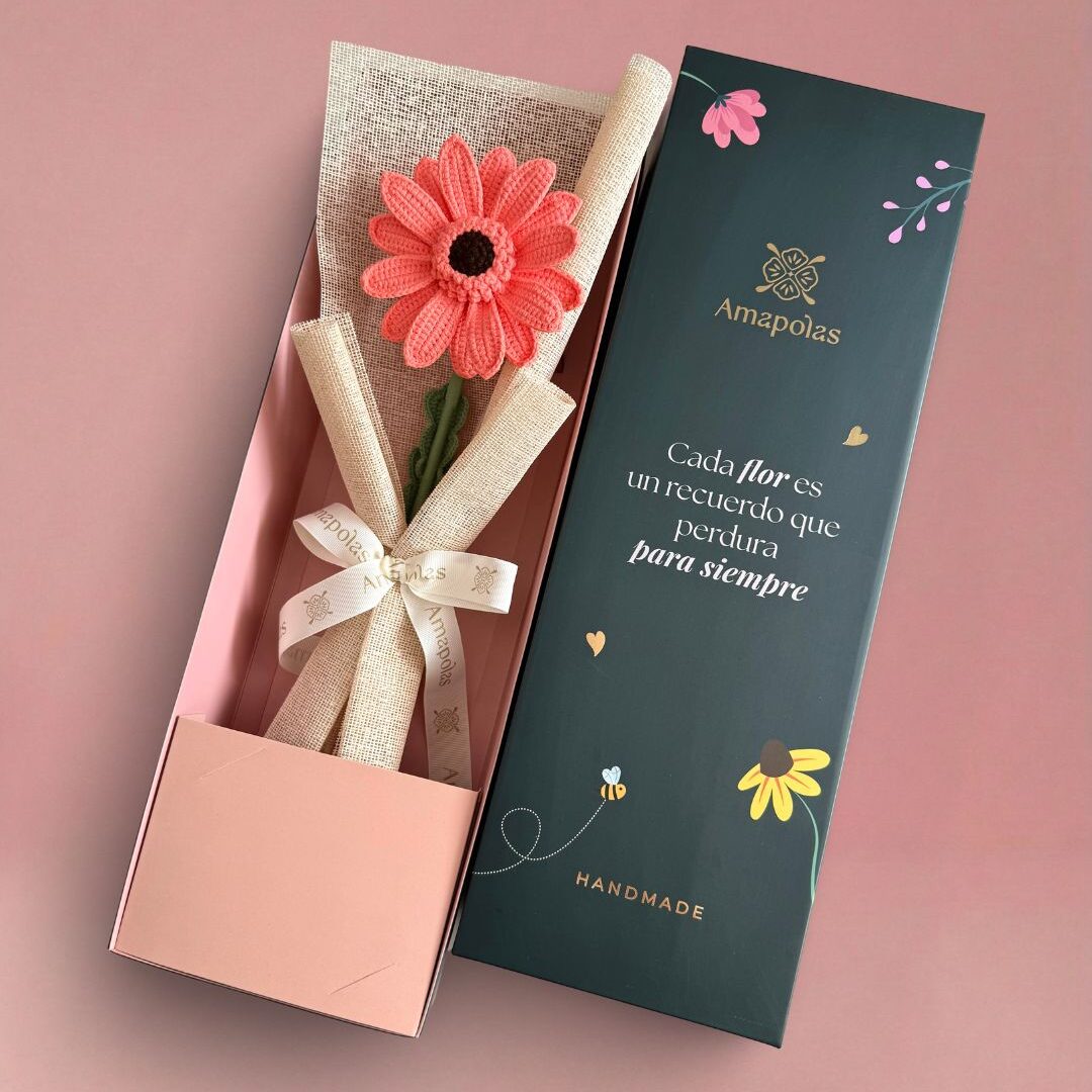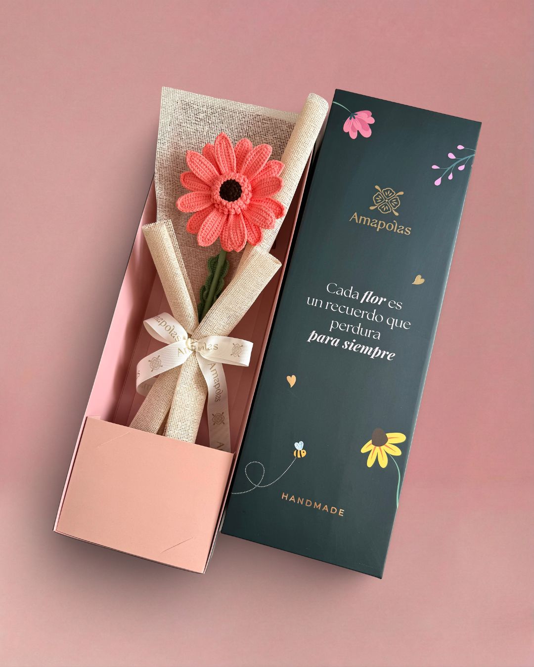 1 hermosa Gerbera tejida pétalo a pétalo en el color que tú elijas aromatizado con suaves fragancias florales, para una experiencia sensorial única. Presentado en nuestra exclusiva caja de la marca, pensada para sorprender.