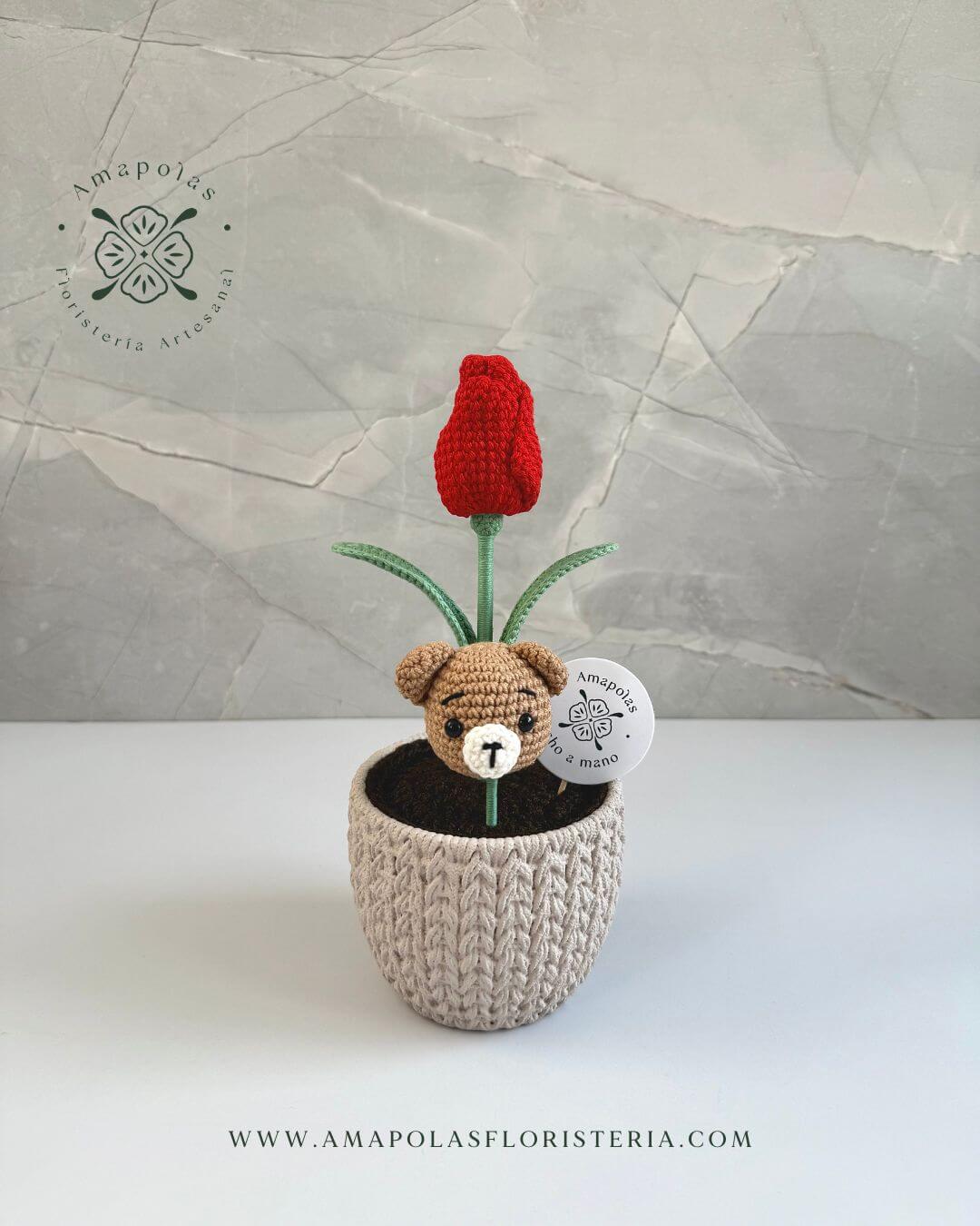 1 elegante tulipán tejido pétalo a pétalo y 1 adorable osito en macetero exclusivo para la marca. Aromatizado con suaves fragancias florales, para una experiencia sensorial única. Presentado en nuestra exclusiva bolsa de regalo de la marca, pensada para sorprender.
