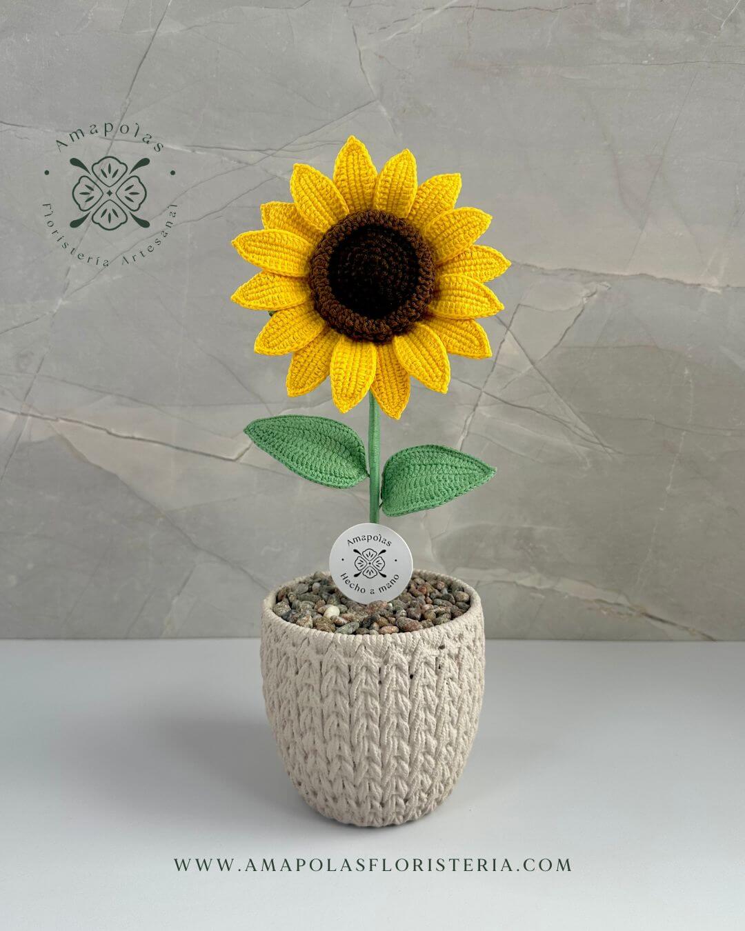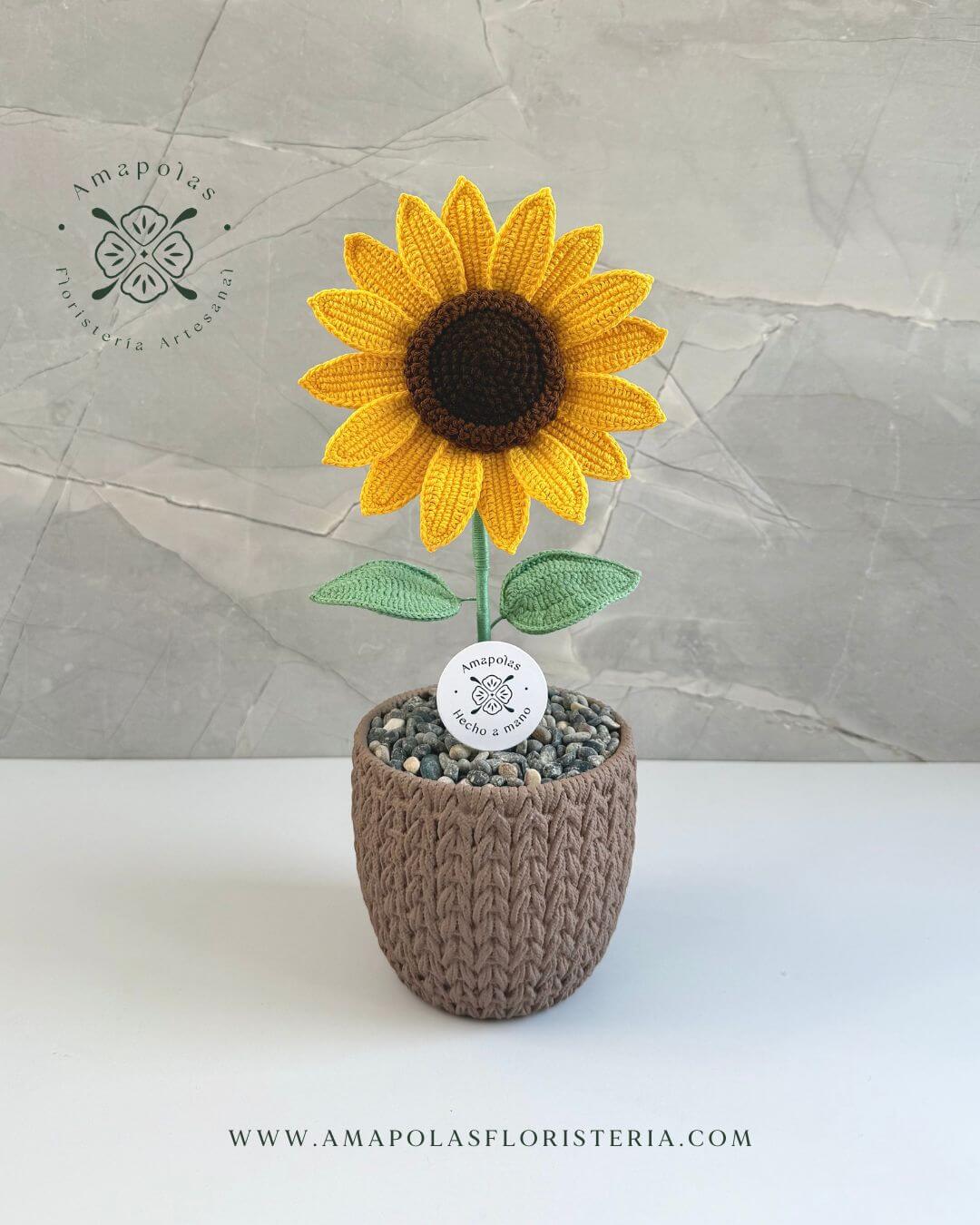 1 hermoso girasol tejido pétalo a pétalo en exclusivo macetero artesanal decorado con piedras naturales que realzan su belleza. Aromatizado con suaves fragancias florales, para una experiencia sensorial única.