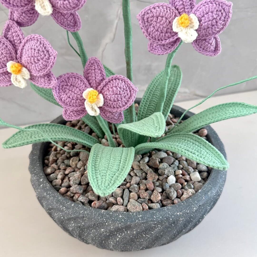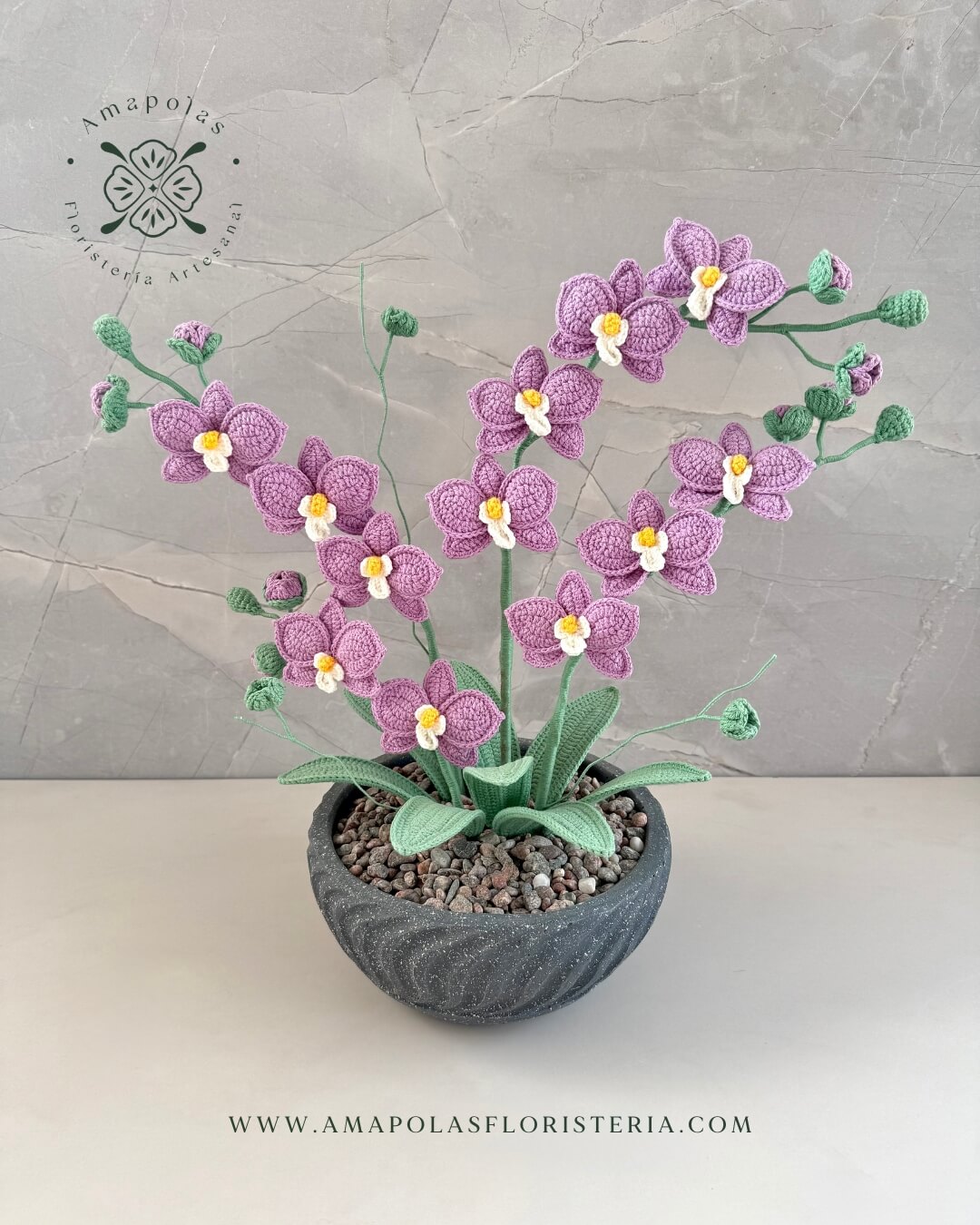 Orquídea tejida a mano, pétalo a pétalo, con delicadeza y amor en exclusivo macetero artesanal decorado con piedras naturales que realzan su belleza. Aromatizado con suaves fragancias florales, para una experiencia sensorial única.