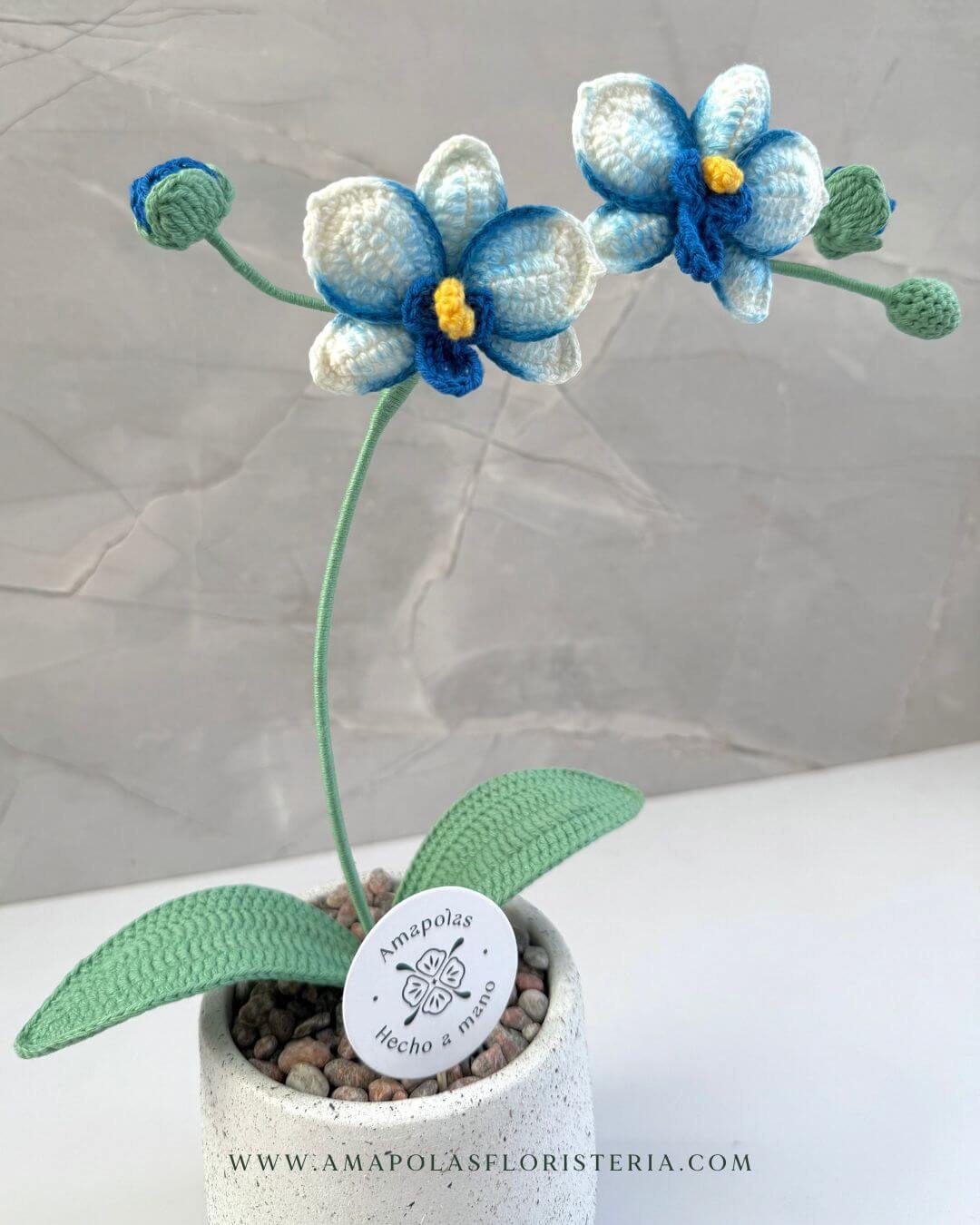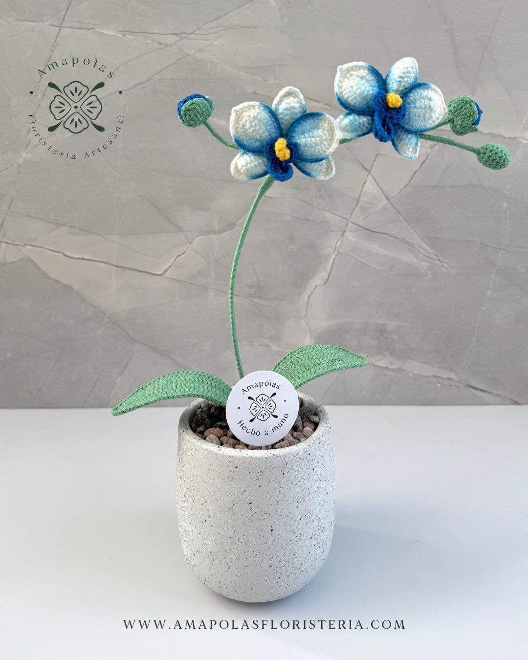 Orquídea tejida a mano, pétalo a pétalo, con delicadeza y amor en exclusivo macetero artesanal decorado con piedras naturales que realzan su belleza. Aromatizado con suaves fragancias florales, para una experiencia sensorial única.
