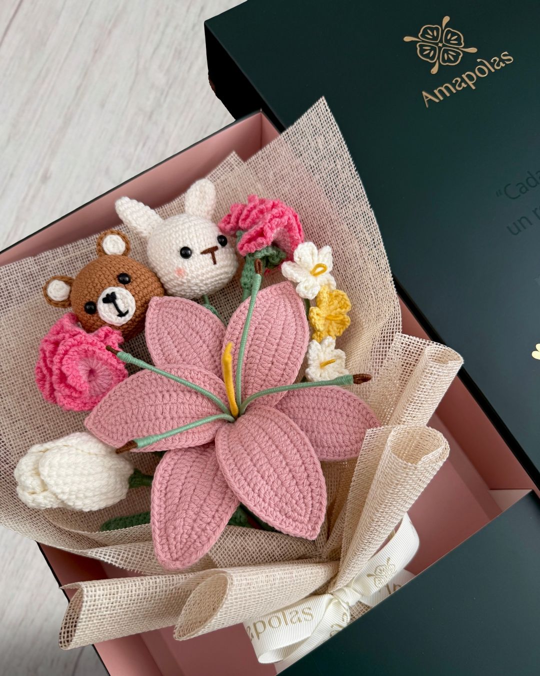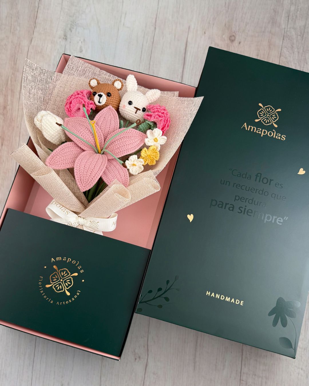 Radiante lirio tejido, junto a 2 hermosos claveles, 1 elegante tulipán tejido pétalo a pétalo, una adorable conejita y un tierno osito, junto a 4 mini flores tejidas realzando la belleza del ramo. Aromatizado con suaves fragancias florales, para una experiencia sensorial única y presentado en nuestra nueva caja GRAND DELUXE, diseñada para quienes buscan un impacto inolvidable.