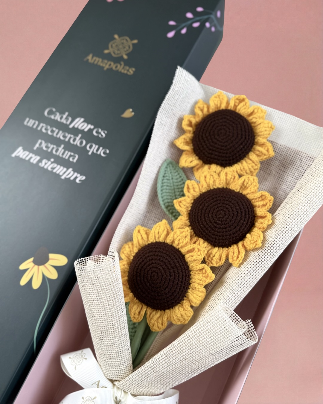 Ramo de 3 hermosos girasoles tejidos aromatizado con suaves fragancias florales, para una experiencia sensorial única. Presentado en nuestra exclusiva caja de la marca, pensada para sorprender.