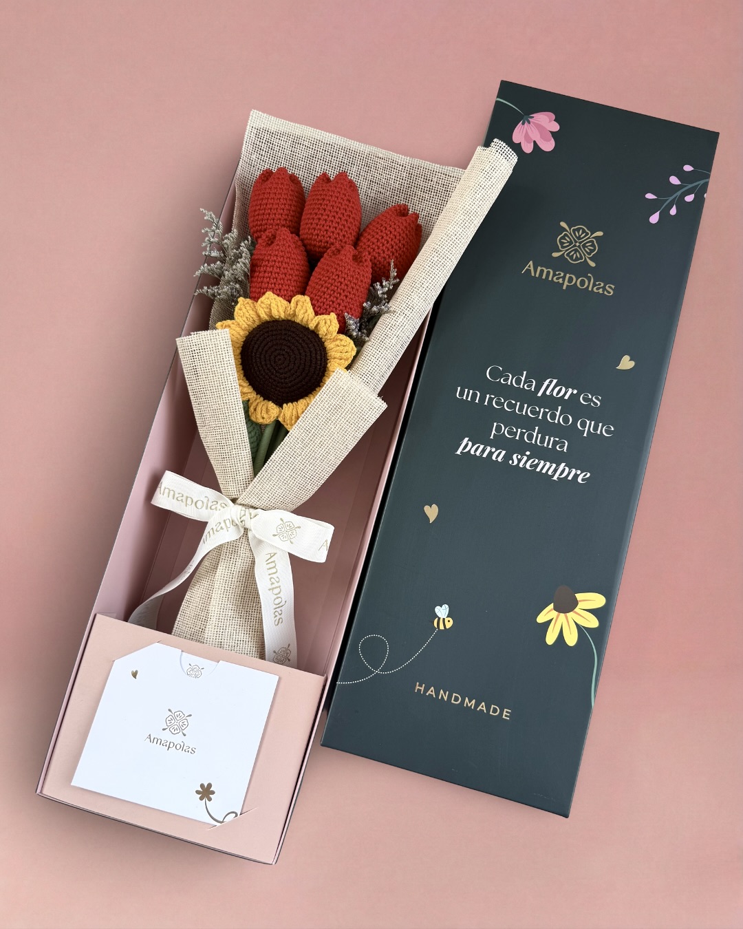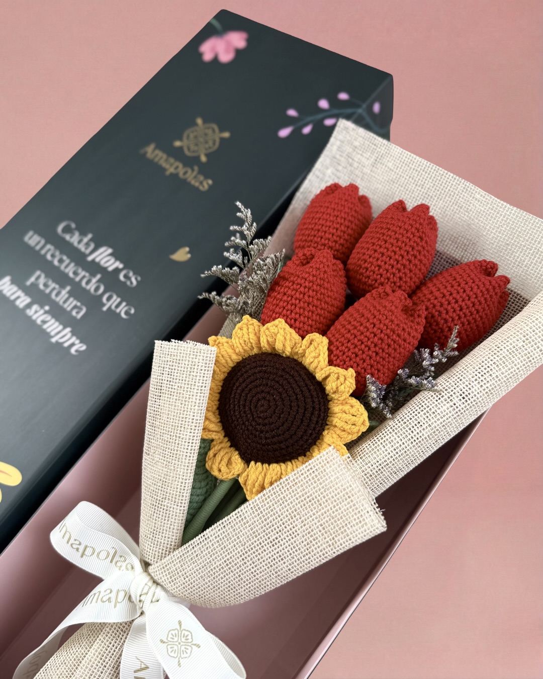 1 radiante girasol tejido junto a 5 elegantes tulipanes, aromatizados con suaves fragancias florales, para una experiencia sensorial única. Presentado en nuestra exclusiva caja de la marca, pensada para sorprender.