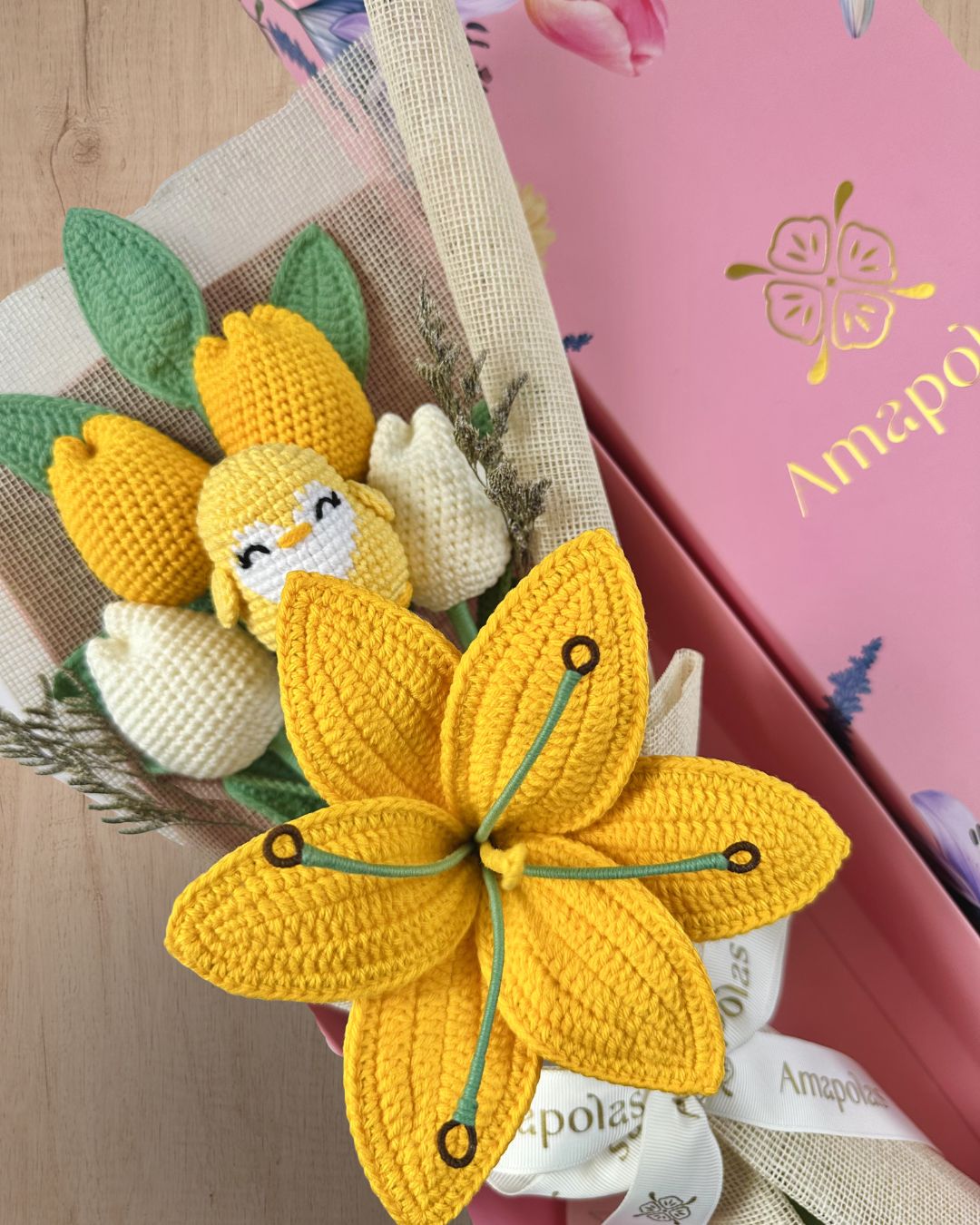 4 elegantes tulipanes, un adorable pingüinito y un radiante lirio, decorado con verdes de estación, realzando su belleza natural. Aromatizado con suaves fragancias florales, para una experiencia sensorial única y presentado en nuestra nueva caja EDICIÓN LIMITADA, ideal para hacerlo mucho más único.