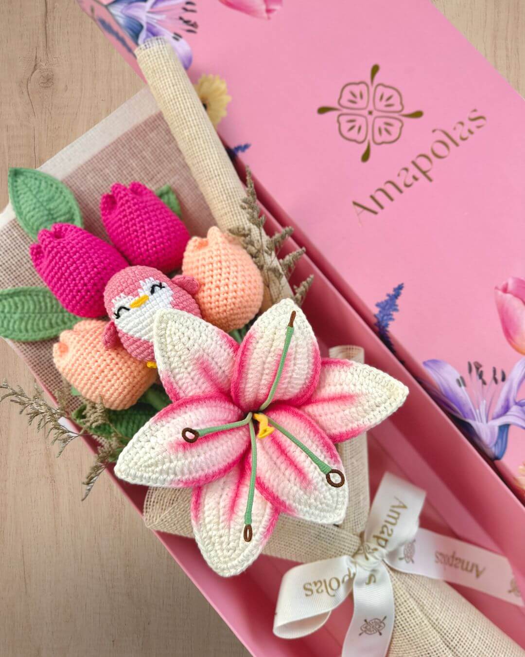 * 🌷4 elegantes tulipanes, un adorable pingüinito y un radiante lirio, todo armonizado con delicadeza.