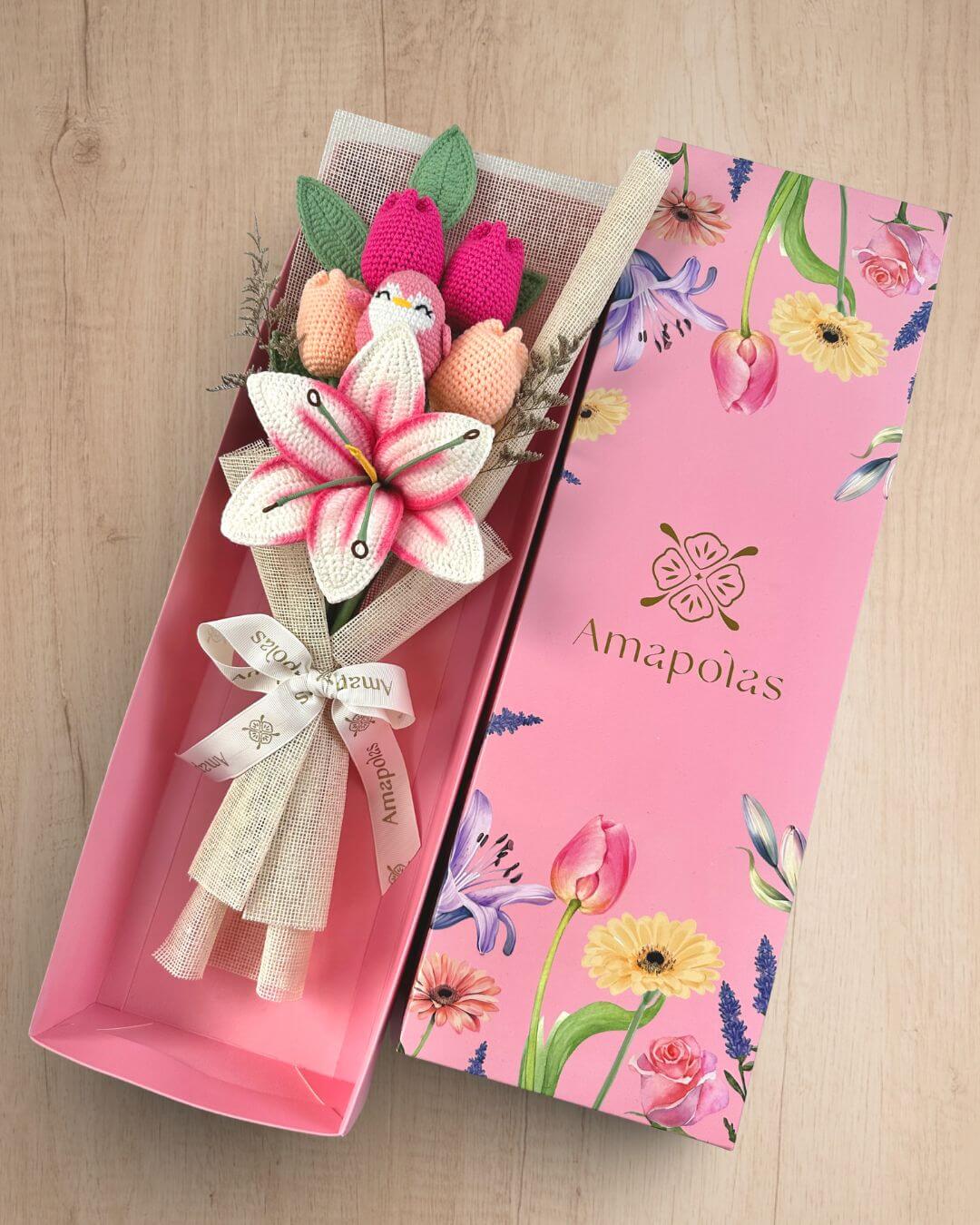 4 elegantes tulipanes, un adorable pingüinito y un radiante lirio, decorado con verdes de estación, realzando su belleza natural. Aromatizado con suaves fragancias florales, para una experiencia sensorial única y presentado en nuestra nueva caja EDICIÓN LIMITADA, ideal para hacerlo mucho más único.