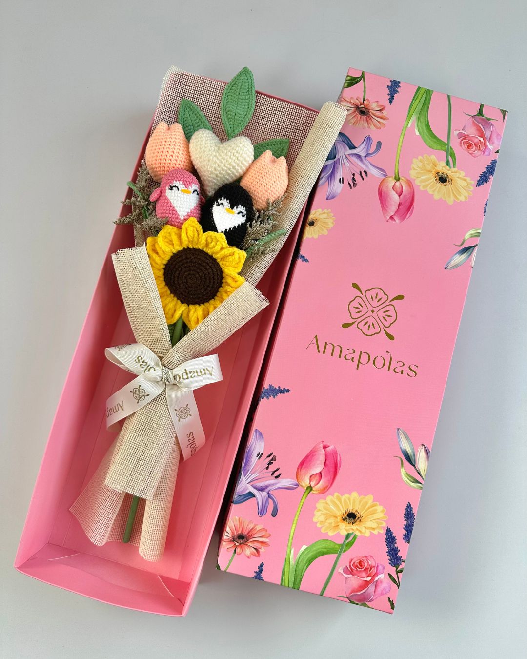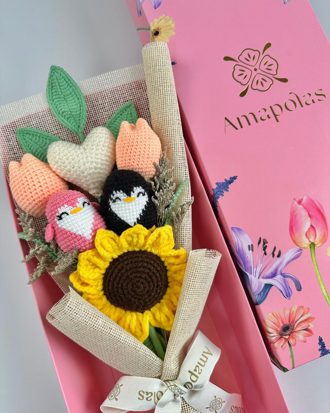 1 hermoso girasol, 2 adorables pingüinitos tejidos, follaje, dos tulipanes y un corazón en el color de tu elección decorado con verdes de estación, realzando su belleza natural. Aromatizado con suaves fragancias florales, para una experiencia sensorial única y presentado en nuestra nueva caja EDICIÓN LIMITADA, ideal para hacerlo mucho más único.