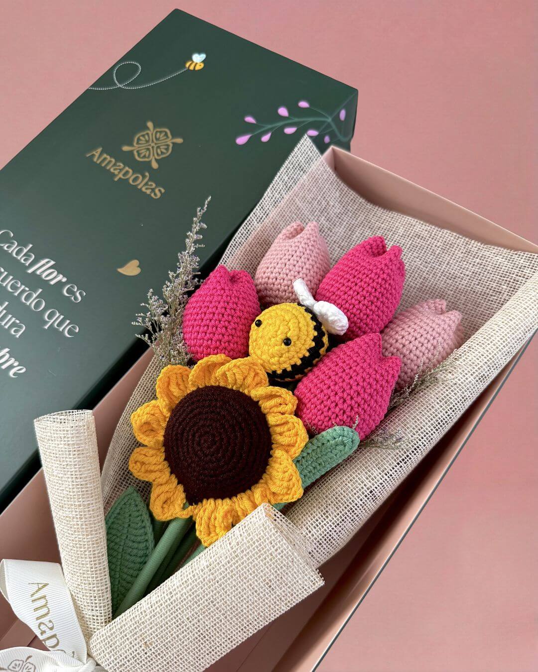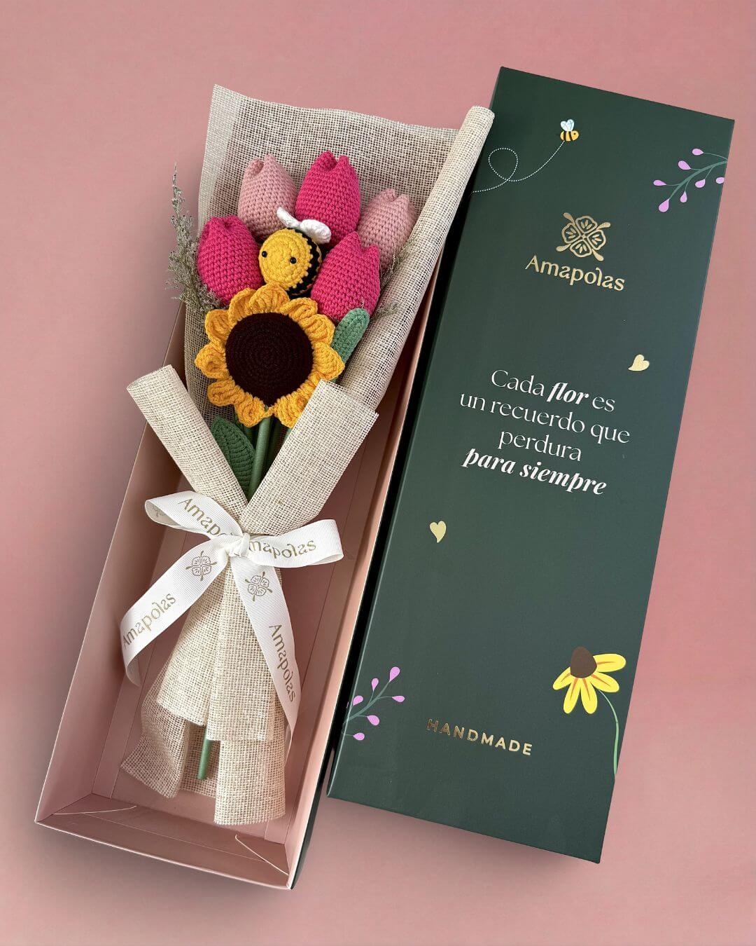 Ramo de 1 hermoso girasol tejido, 1 adorable abejita tejida y 5 elegantes tulipanes, con los colores que tú elijas. Aromatizado con suaves fragancias florales, para una experiencia sensorial única. Presentado en nuestra exclusiva caja de la marca, pensada para sorprender.
