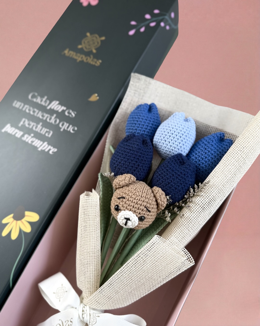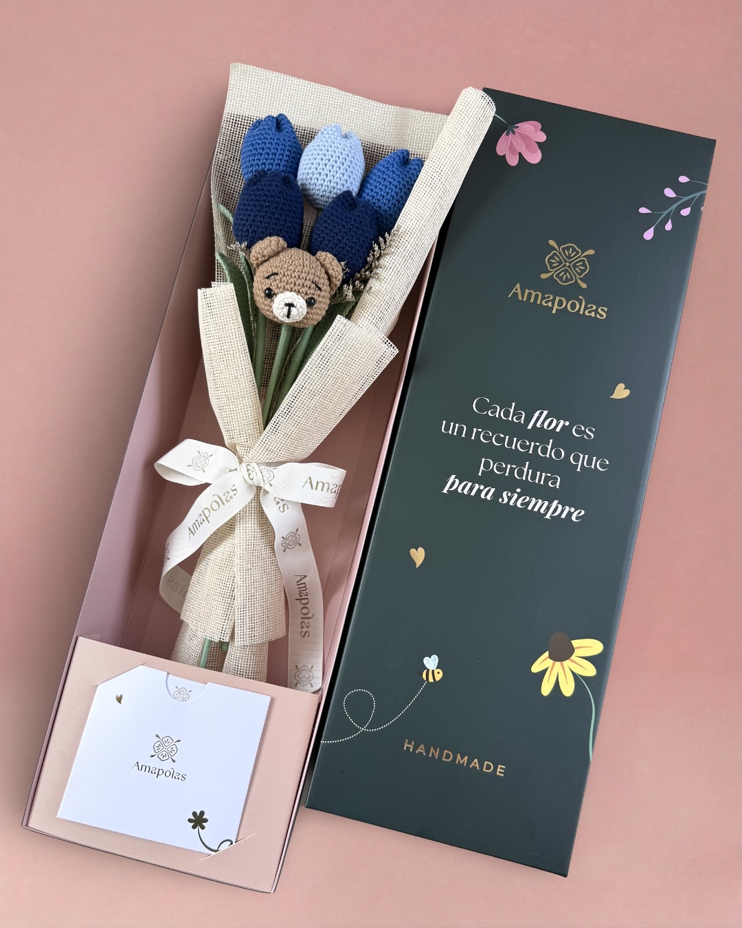 5 elegantes tulipanes en colores a tu elección y 1 adorable osito tejido aromatizado con suaves fragancias florales, para una experiencia sensorial única. Presentado en nuestra exclusiva caja de la marca, pensada para sorprender.
