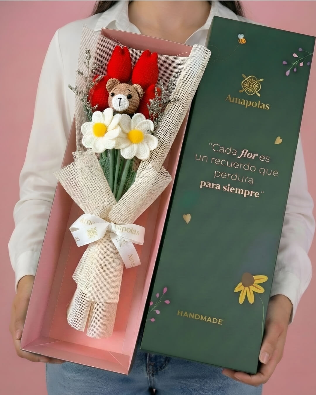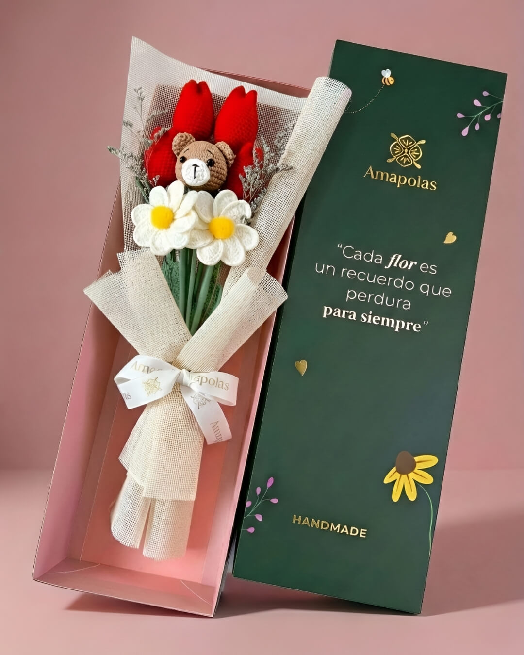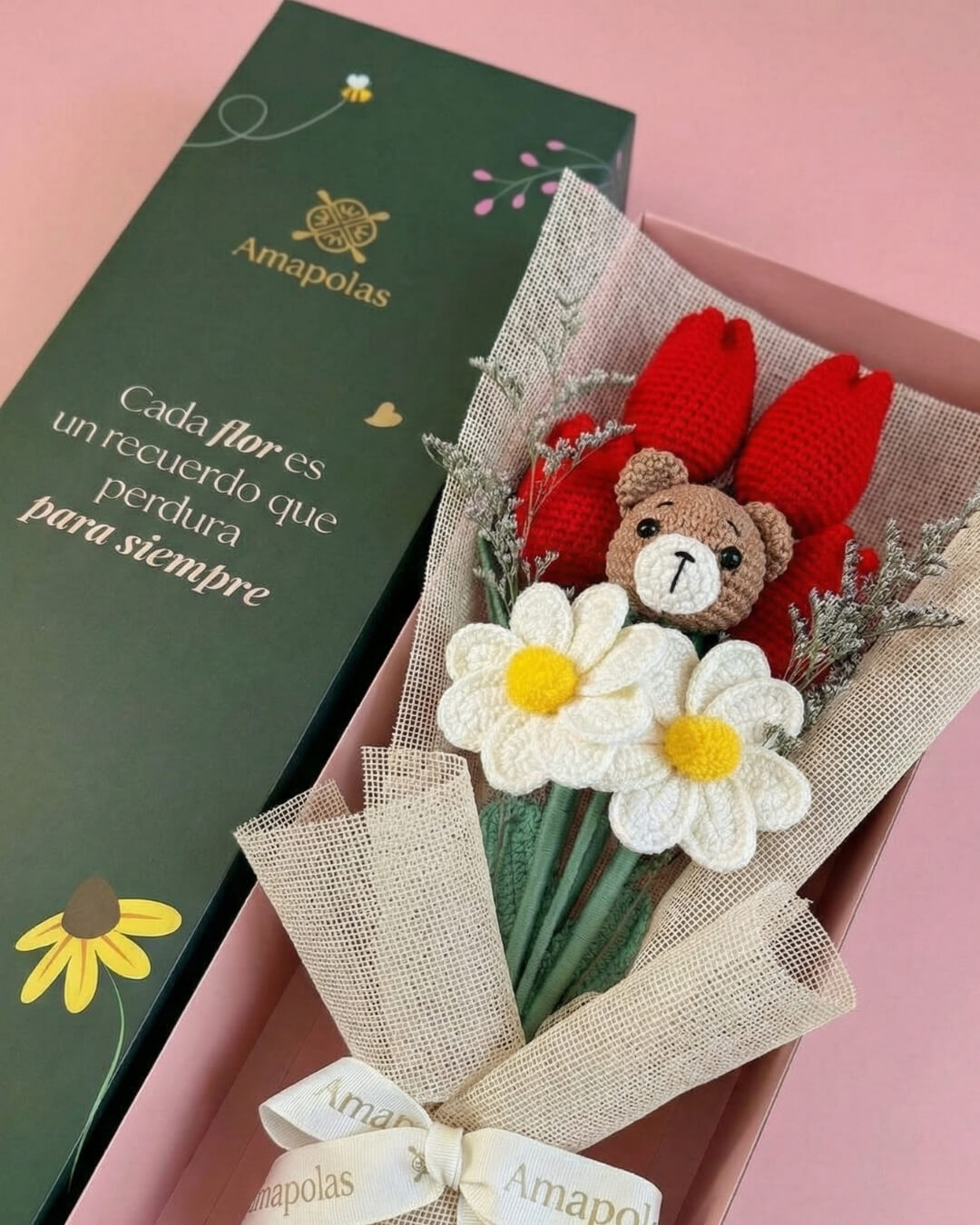 Adorable osito tejido, 4 elegantes tulipanes y 2 hermosas margaritas decorado con verdes de estación, realzando su belleza natural. Aromatizado con suaves fragancias florales, para una experiencia sensorial única y presentado en nuestra exclusiva caja de la marca, pensada para sorprender.