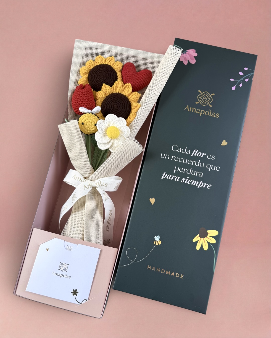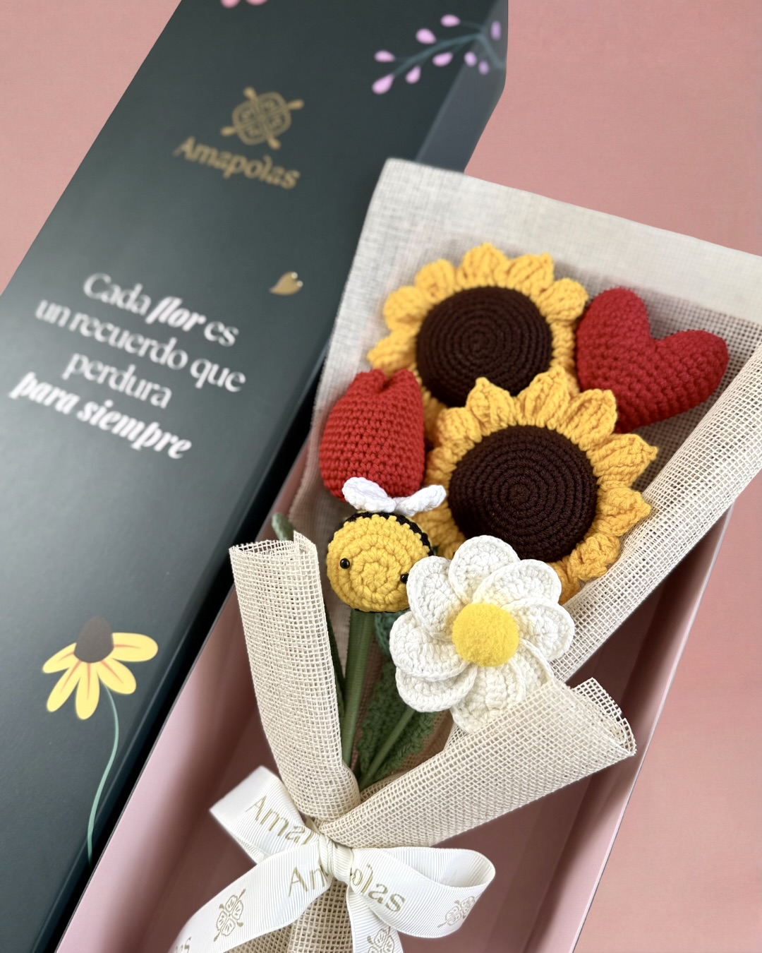 2 hermosos girasoles tejidos, 1 margarita tejida pétalo a pétalo, 1 elegante tulipán, una dulce abejita y un corazón tejido en el color de tu elección aromatizado con suaves fragancias florales, para una experiencia sensorial única. Presentado en nuestra exclusiva caja de la marca, pensada para sorprender.